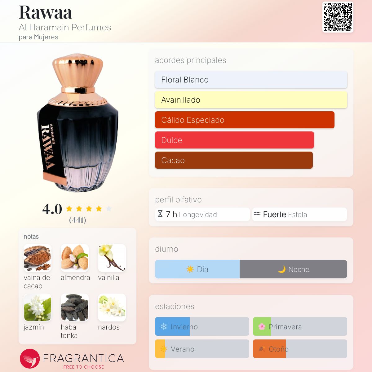 Al Haramain Rawaa para Mujer es una fragancia encantadora, lanzada en 2018. Esta fragancia de ámbar y vainilla irradia calidez y encanto.