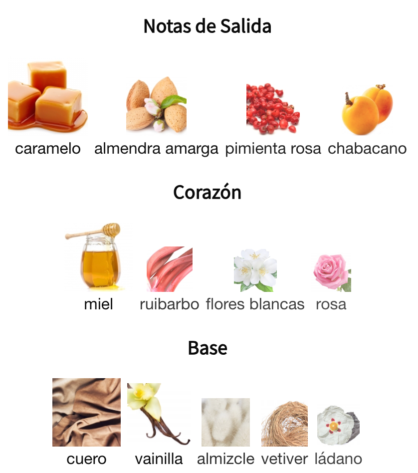 Las Notas de Salida son pimienta rosa, caramelo, almendra amarga y albaricoque; las Notas de Corazón son miel, flores blancas, ruibarbo y rosa; las Notas de Fondo son vainilla, cuero, almizcle, vetiver y ládano.