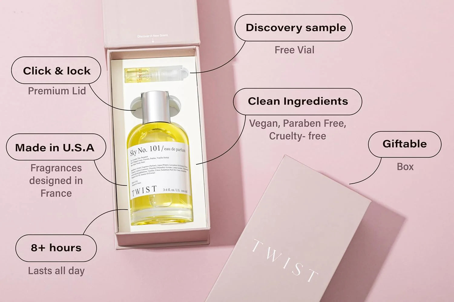 Una fragancia floral afrutada y gourmand para mujer, con una salida vibrante de lavanda, pera y bergamota. El corazón revela una rica mezcla de crema batida, coco, praliné y orquídea de vainilla, mientras que el fondo perdura con un suave almizcle y cálidas notas amaderadas.